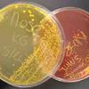 3. Mannitol Salt Agar. Left plate is growing mannitol+ pathogen Staphylococcus aureus. Right plate growing mannitol- normal flora Staphylococcus epidermidis.