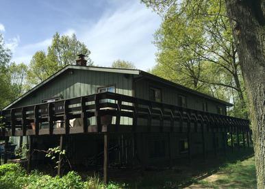 Under back portion of deck, facing east, 29 inches (73.6 cm) above the ground, built on top of the home's electric meter.