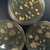 Tiny, punctiform, creamy white bacterial colonies characteristic of Staphylococcus, growing on Mannitol Salt Agar (MSA).