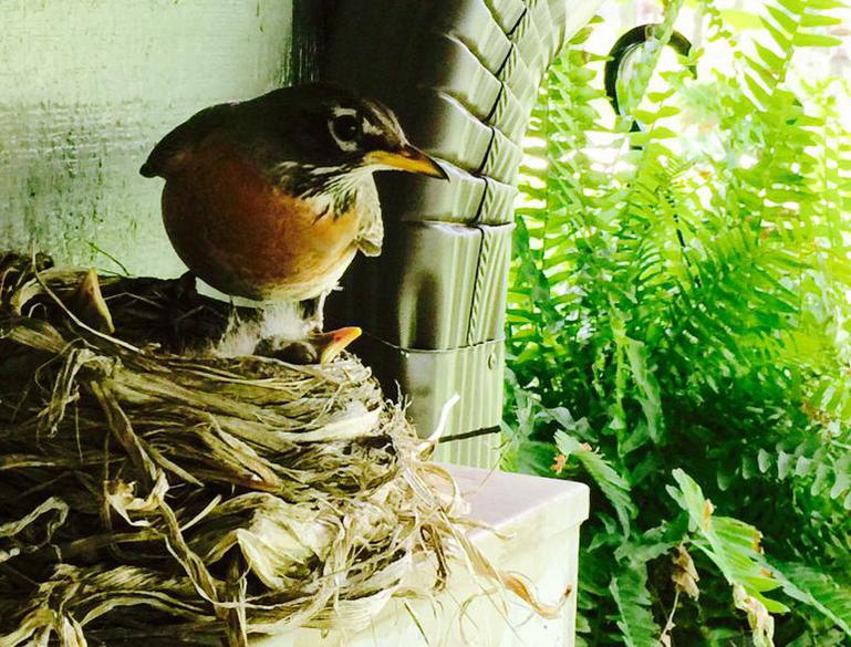 American robin female "Wilma" tending her first nest of the 2015 season.